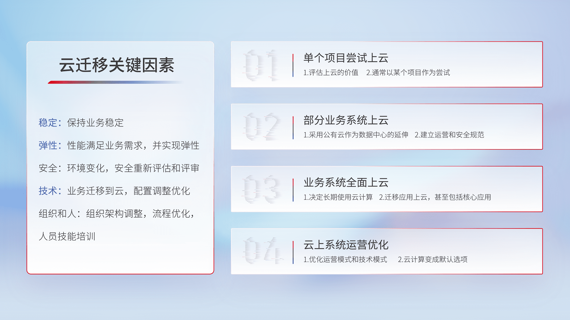结合实际业务,,,,从规划设计、、、、云平台选型、、云原生改造、、、、数据迁移、、、集成交付,,,,迁移全过程为客户识别最佳上云路径,,做好风险识别管理,,设计网络架构、、、身份权限、、、、安全审计合规、、、、操作审计、、、、日志审计、、、、监控告警策略、、、多站点容灾设计等,,,对云上基础设施进行整体规划,,,,提升IT治理水平,,,,以满足弹性、、、、高可用、、、高性能的需求。。。。