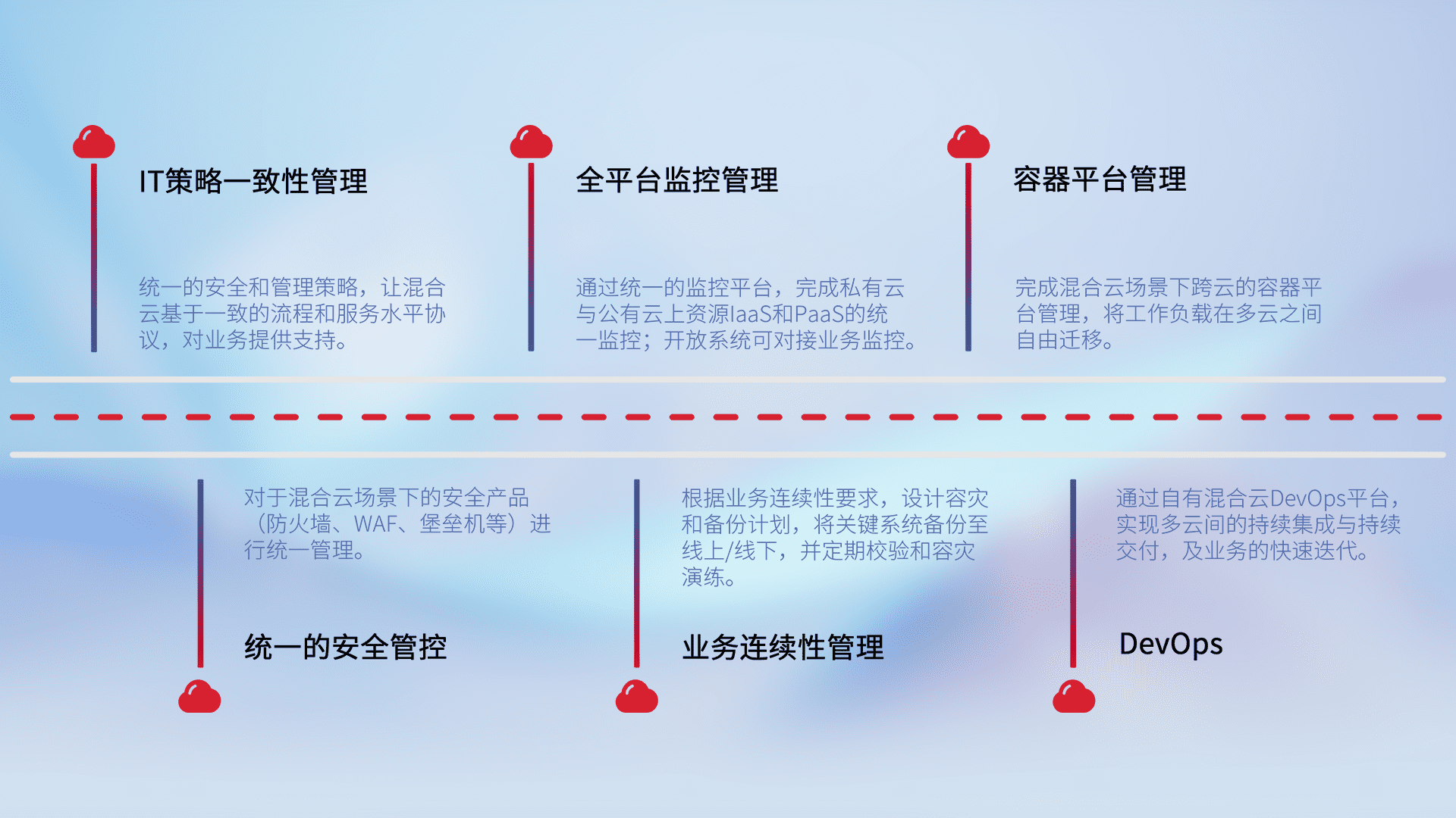 通过多云纳管,,,以统一的资源数据模型把客户的云资源进行抽象和封装,,,,进而实现对多云资源的统一操作,,,,保障云资源管理的可靠性、、、稳定性与可用性。。。量身定制化运维内容,,,配置、、、开发运维、、补丁管理、、、、备份、、监控、、、认证和访问管理、、、审计和日常巡检等,,,保障在用云过程中的可靠度,,稳定度以及高可用率。。。。