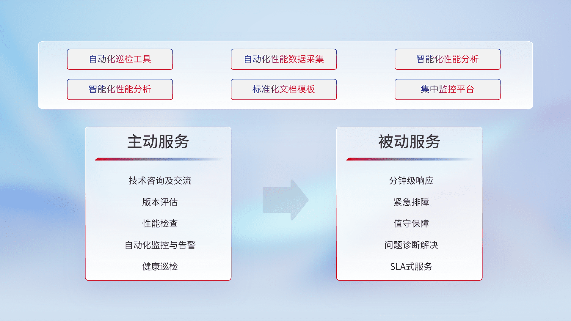 智能化工具和标准化文档,,保障服务质量,,,,提供主动服务(包含技术咨询、、、、版本评估、、、性能检查、、自动化监控与告警、、、健康巡检)和被动服务包含(分钟级响应、、、、紧急排障、、、值守保障、、、问题诊断解决、、、、SLA服务)。。
